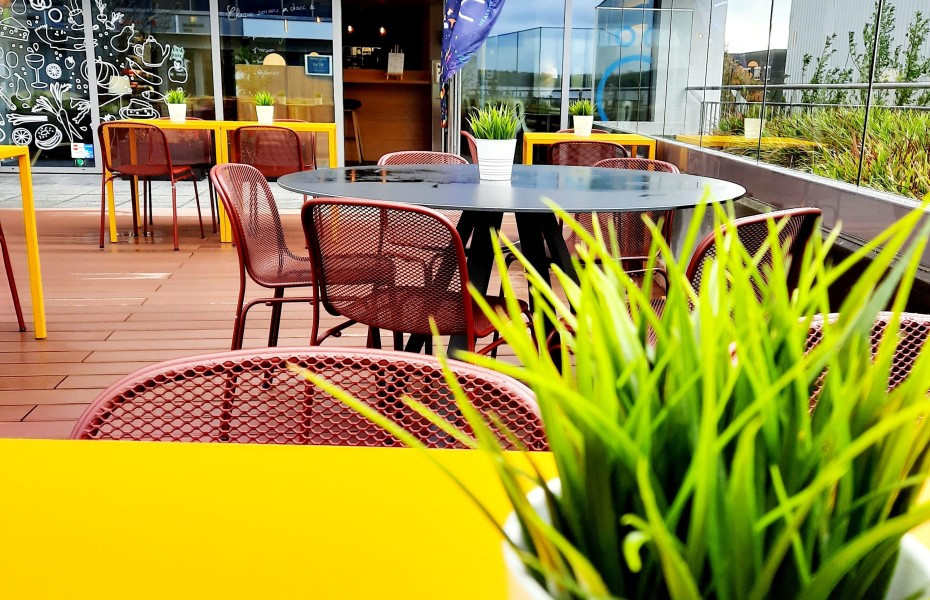 Pour fêter cette reprise, Campus Contern était à pied d’œuvre pour préparer la réouverture du restaurant : une toute nouvelle terrasse, relookée et réaménagée pour apporter du confort et de l’envie à tous les locataires. Les tables jaunes illuminent les lieux même par temps maussade si bien qu’il ne fait plus jamais vraiment gris ici.