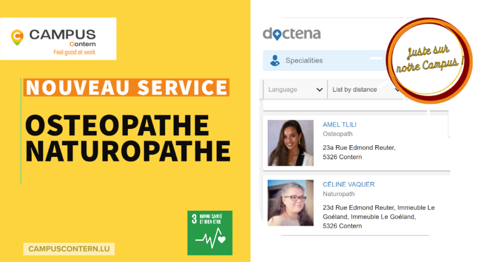 C’est unique et sûrement une première sur Luxembourg : nos locataires ont maintenant une ostéopathe et une naturopathe à maximum 100 m / 2 minutes à pied de leur bureau.