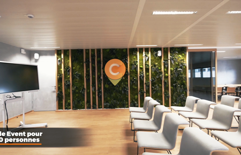 Nous avons ouvert la location de notre belle salle à tout le monde parce qu’elle est idéale pour les événements d’entreprise : elle est jolie et accueillante avec un magnifique mur végétal stabilisé, un système audio vidéo de pointe et très flexible et du matériel design et confortable. Sans oublier une cuisine traiteur avec tout ses équipements.